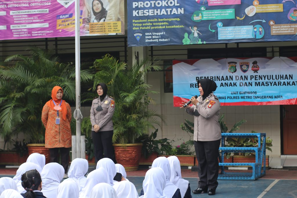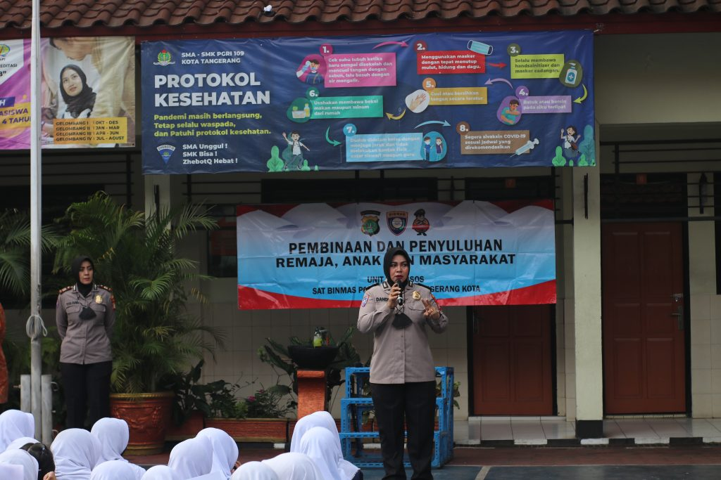 Unit SAT BINMAS POLRES METRO TANGERANG KOTA hadir di SMA PGRI 109 Tangerang pada hari senin, 16 Januari 2023 dalam program polisi mengajar. Pada kesempatan ini mereka mensosialisasikan tentang PEMBINAAN DAN PENYULUHAN REMAJA, ANAK DAN MASYARAKAT. Kegiatan ini bertujuan memberikan pengetahuan kepada para pelajar sebagai generasi penerus bangsa yang memiliki semangat yang tinggi dan mempunyai prestasi yang dapat dibanggakan bagi dirinya, keluarga, sekolah dan masyarakat di lingkungannya. Seperti yang kita ketahui pelajar adalah remaja sedang berada difase peralihan dari masa anak-anak menuju dewasa. Oleh sebab itu, banyak perubahan pada remaja tidak hanya secara fisik tetapi juga cara berpikir pun ikut berubah dan tidak memikirkan konsekuensinya. Misalnya merokok, obat – obatan terlarang, tawuran dan sebagainya. Tentunya dengan kegiatan ini para siswa SMA PGRI 109 Tangerang menambah pengetahuan bagi mereka sebagai generasi penerus bangsa.